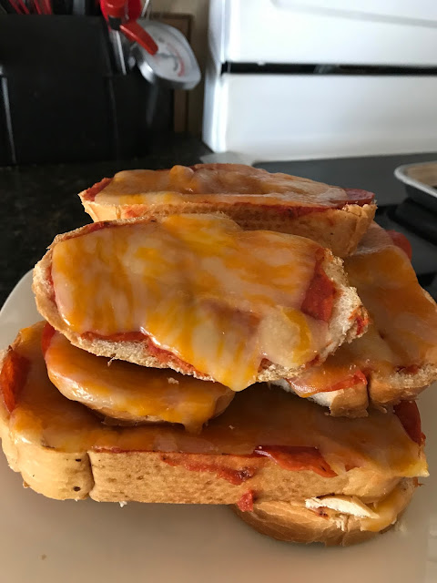 Now, my method is slightly different from what I've seen on Pinterest (cutting the bread in half lengthwise, baking at 425, etc) and to be fair, that method might be faster and it's easier to customize toppings. I know I found my method somewhere on Pinterest but I cannot find the pin so hopefully no one is upset I've stolen their recipe. But we like my method and I can't wait to give the other one a try. I just like to be honest and if there's a better way to do something then I want to give you a heads up.